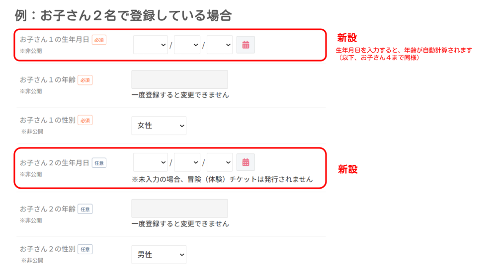 2026年9月分より、生年月日入力(登録)情報をもとにお子さんの冒険(体験)チケット発行数を確定します