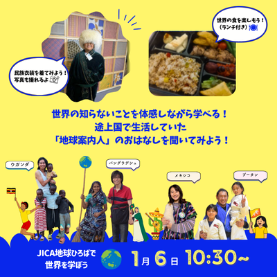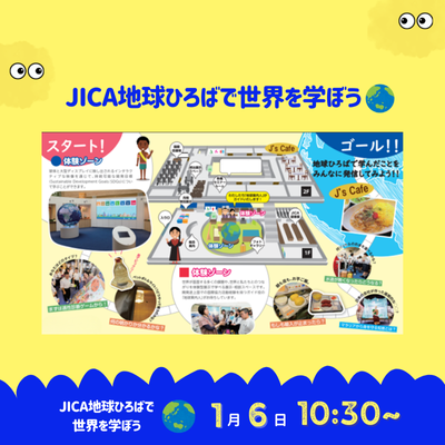 ⛔先着順となります。 ⛔保護者やきょうだいのご参加は任意です(ご参加される方全員のチケットをお申込ください) ⛔ランチは、アレルギー対応食ではありません。 ⛔ランチが不要な方は、学習体験終了後にご帰宅いただいても構いません。受付時にお知らせください。 ーーーーーーーーーーーーーーーー 【開催概要】 ◆日時:1月6日(火)学習体験10:30~12:00+お食事体験(お食事後順次自由解散) ※受付時間:10:15~10:25※遅刻されると参加できない場合があります。 ◆集合場所:JICA 市ヶ谷ビル2階 セミナールーム201 ◆対象年齢:小学4年生以上推奨 ◆入場方法:「申込詳細(マイページ)」画面の「受付」ボタンを受付担当者にご提示ください。 ⚠️お子さまのみ参加の場合は、必ず印刷物をご持参ください 該当URL https://bokenbank.florence.or.jp/stc/casemanage/appliedEntryList/typeA2 ーーーーーーーーーーーーーーー 【施設紹介】 JICA地球ひろばでは、世界が直面する様々な課題や、開発途上国と私たちとのつながりを体感できます。 世界のことを楽しく学べる施設です。 ◆参考URL https://www.jica.go.jp/domestic/hiroba/index.html ーーーーーーーーーーーーーーー 【おすすめポイント】 🌍世界の人々の暮らしや抱える課題を紹介する展示を、開発途上国に住んでいた「地球案内人」がご案内します! 🌍今回は12月8日から始まった基本展示『人間の安全保障展 世界を知る、世界を変える!』をご紹介! 🌍JICA海外協力隊の体験談が聞けるよ!現地の生活をのぞいてみよう! 🌍世界各国のメニューを提供する「J's Cafe」のお弁当つき!食事を通じて世界を知ろう! 🌍世界の民族衣装を着ることができるコーナーもあるよ! ーーーーーーーーーーーーーーー ⛔お願い⛔ 以下にございます、お知らせ・特記事項/お問い合わせ先/冒険(体験)場所詳細の欄も必ずご確認ください |