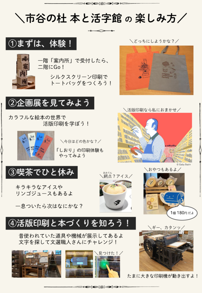 ⛔️参加する人数分お申し込みください(保護者の方もご参加いただけます) 例)保護者1名、子ども2名参加=「大人1・子ども2」 ⛔️小学生以下のお子様は保護者の同伴が必須です ---------------------------------------- 【参加概要】 ◆日時:10月12日(日)10:30~11:00 ◆対象年齢:全年齢(保護者の方もご参加いただけます) ◆持ち物:特になし ◆入場方法:チケット申込後にこども冒険バンクから送信される『冒険(体験)参加申込み完了メール』画面もしくは印刷物を、1階案内所でご提示ください。 【冒険の内容・おすすめポイント】 ①シルクスクリーン印刷で「オリジナルトートバッグ」をつくります。バッグは2色、絵柄は「活版印刷道具」と「鋳造機」から選べます。 ②2階展示室では、ギャビー・バザンの絵本「デザインのアトリエ 活版印刷」を題材にした企画展が開催中です。 ③お子様と同伴の方に無料ドリンク券をお配りしております、ぜひ1階喫茶もご利用ください。 ④活版印刷と本づくりをテーマとした常設展示も無料でご見学いただけます。 ぜひお出かけ前に、当館Webサイトをご覧ください。 https://ichigaya-letterpress.jp --------------------------------------------------------------------------------------- ⛔️お願い⛔️ 以下にございます、お知らせ・特記事項 / お問い合わせ先 / 冒険(体験)場所詳細の欄も必ずご確認ください |