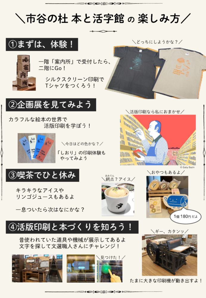 | ⛔️お申込み後、「冒険(体験)に申し込みました。」というメールが届いたら参加確定です ⛔️参加するお子様のみお申し込みください 例)子ども2名参加=「大人0・子ども2」 ⛔️小学生以下のお子様は保護者の同伴が必須です ⛔️保護者のチケットは不要です 例)大人1名、子ども2名参加=「大人0・子ども2」 これで、子ども2名と保護者1名(計3名)参加となります。 ---------------------------------------- 【参加概要】 ◆日時:9月20日(土)10:30~11:30 ◆対象年齢:全年齢(お子様のみ参加可能) ◆持ち物:特になし ◆入場方法:チケット申込後にこども冒険バンクから送信される『冒険(体験)参加申込み完了メール』画面もしくは印刷物を、1階案内所でご提示ください。 【Tシャツのサイズについて】 以下のサイズをご用意しておりますが、当日在庫がない場合もございます。 あらかじめご了承ください。 ・120(身丈:48cm、身幅:35cm、肩幅:31cm、袖丈:14cm) ・130(同:52cm、37cm、33cm、15cm) ・150(同:60cm、43cm、38cm、17cm) ・S(同:66cm、49cm、44cm、19cm) 【冒険の内容・おすすめポイント】 ①シルクスクリーン印刷で「オリジナルTシャツ」をつくります、絵柄は「活版印刷道具」と「鋳造機」から選べます。 ②2階展示室では、ギャビー・バザン デザインの絵本「デザインのアトリエ 活版印刷」を題材にした企画展が開催中です。 ③お子様と同伴の方に無料ドリンク券をお配りしております、ぜひ1階喫茶もご利用ください。 ④活版印刷と本づくりをテーマとした常設展示も無料でご見学いただけます。 ぜひお出かけ前に、当館Webサイトをご覧ください。 https://ichigaya-letterpress.jp --------------------------------------------------------------------------------------- ⛔️お願い⛔️ 以下にございます、お知らせ・特記事項 / お問い合わせ先 / 冒険(体験)場所詳細の欄も必ずご確認ください | |