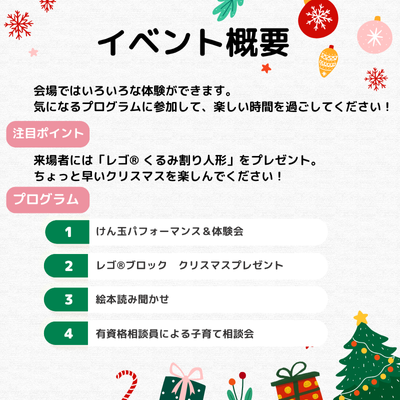⛔️親子での参加が必須です(特段のご事情がある場合は、申し込み後お問い合わせください) ⛔️チケットは参加されるお子さんと保護者の人数分の枚数を必ずお申し込み下さい ⛔️会場規模の関係で、1家庭4名までお申込みいただけます ⛔️おもちゃのクリスマスプレゼントは、1家庭1個のお渡しです。 ⛔️広報活用を目的に当日写真撮影をさせていただきます。撮影にご協力・ご了承いただける方のみお申込み下さい 【参加概要】 ◆日時:2025年12月13日(土)13:00~14:00 ※入退場自由(プレゼントはお帰りの際にお渡しいたします) ◆推奨年齢:3歳以上~未就学のお子さん (お渡しするプレゼントの対象年齢が3歳以上のため、該当の年齢を推奨年齢としています。ただし、当該年齢以外の参加も可能です) ◆持ち物:大きめのエコバック等(プレゼント品等をお持ち帰りいただくためにご持参ください) ◆入場方法:チケット申込後にこども冒険バンクから送信される『冒険(体験)参加申込み完了メール』画面もしくは印刷物を、当日受付でご提示ください 【冒険の内容】 ◆クリスマスプレゼントとしてレゴ®ブロックをプレゼント!(1家庭1個) ◆けん玉パフォーマンス&体験会:はじめてのお子さんも楽しくチャレンジできます! ◆読み聞かせ:会場内の絵本コーナーで読み聞かせを行います。 ◆子育て相談会:資格を持った相談員が会場におります。どんな小さなことでもお気軽にはなしてみてくださいね。 【当日のスケジュール】 会場10分後~:けん玉パフォーマンス&けん玉WS 会場25分後~:読み聞かせ ※子育て相談会は、お時間内であればいつでもご利用いただけます。 ※上記スケジュールは、予告なく変更になる場合がございます。 ⛔️お知らせ・特記事項 / お問い合わせ先 / 冒険(体験)場所詳細の欄も必ずご確認ください |