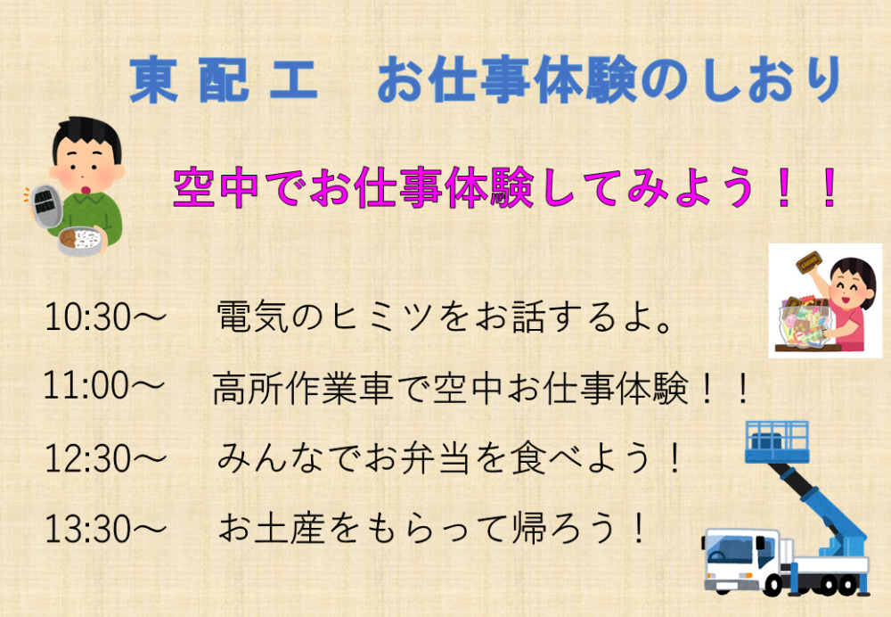 ⛔️チケットは参加されるお子さんと保護者の人数分の枚数を必ずお申し込み下さい ※お子さんが中学生以上の場合は保護者の参加は任意です ⛔️保険(追加費用なし)等の手続きに必要な個人情報を、後日メールにて収集いたします。そちらの回答をもって、正式に参加確定となりますのでご注意ください。 ------------------------------------------------------------------------- 【参加概要】 ◆日時:2025年11月29日(土)10:30~13:30(昼食時間含む) ◆対象年齢:小学1年生以上 ◆持ち物:運動靴(小雨決行時は雨合羽) ◆受付方法:「マイページ」から「申込冒険(体験)詳細」画面を開くと、ピンク色の「受付」ボタンが表示されます。その画面をスタッフにご提示ください https://bokenbank.florence.or.jp/stc/casemanage/appliedEntryList/typeA2 【当日の流れ】※イベントの順番は都合により変更される場合があります。 10:30 当日の案内・電気のお仕事紹介 11:00 高所作業車で空中体験&電気工事のお仕事体験 12:30 お弁当タイム 13:30 解散 【冒険の内容・おすすめポイント】 ⚡普段はなかなか乗れない、高所作業車に乗ってみよう! ビル4階ぐらいまで伸びる高所作業車で空中体験!家族みんな※で上空から街を眺めてみよう! ※合計重量150㎏まで(オペレーション担当者を含みます) ⚡電気工事作業で使用する、本物の電線やプロの工具に触れてみよう! 実際に電線を切ってみたりする体験コーナーもあるよ。 ぜったいに切れない手袋って知ってるかな?! ⚡電気に関する簡単な講習で学んでみよう! 映像を通して普段はなかなか見ることのない電気のお仕事を紹介するよ。 「電線のヒミツ」知ってるかな?! ⚡お昼にはお弁当もあります!みんなで一緒に食べよう! お土産にオリジナルグッズもプレゼント! ⛔️お願い⛔️ 以下にございます、お知らせ・特記事項 / お問い合わせ先 / 冒険(体験)場所詳細の欄も必ずご確認ください。 |
